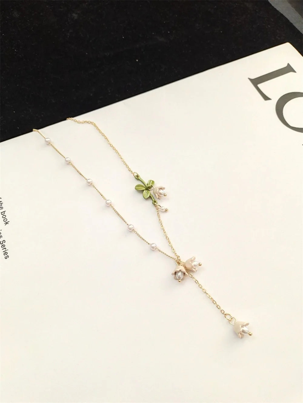 Elegant Mori-inspired necklace featuring a delicate Lily of the Valley pendant paired with dainty pearls. A simple yet fresh design that adds soft, graceful charm to any outfit, perfect for women who love a natural and refined look.