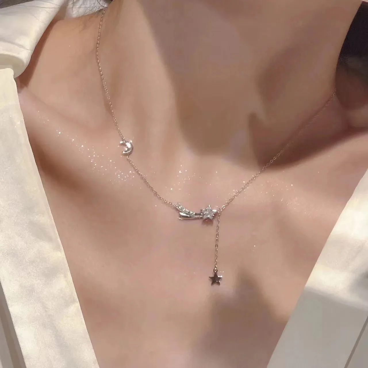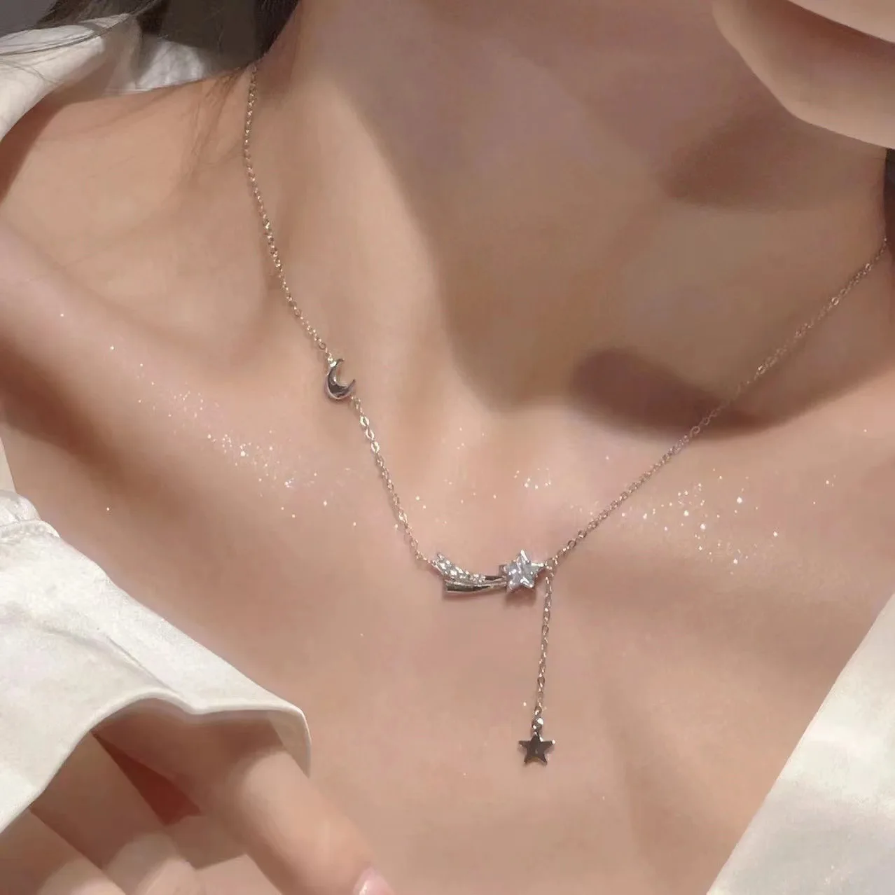 Simple Silver Color Moon Star Tassel Pendant Necklace for Women – Dainty Jewelry